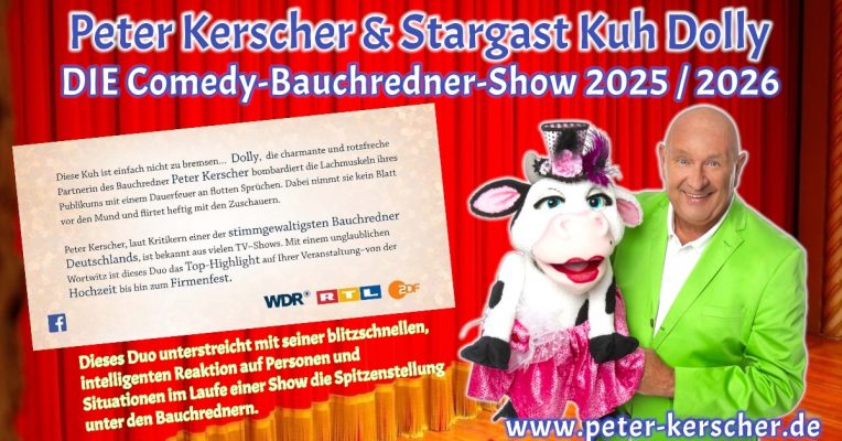 Bekannt aus verschiedenen Fernsehsendungen wie „ZDF – Fernsehgarten“ oder „Karneval hoch drei“, um nur einige zu nennen, ist Peter Kerschner einer der stimmgewaltigsten Bauchredner Deutschlands und wurde vielfach ausgezeichnet. Mit seiner „Partnerin“ Kuh Dolly, die kein Blatt vor den Mund nimmt, bombardiert der Sympathieträger des Kölner Karnevals die Lachmuskeln des Publikums.