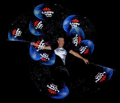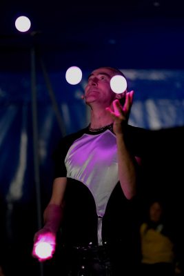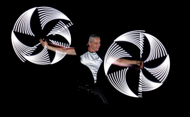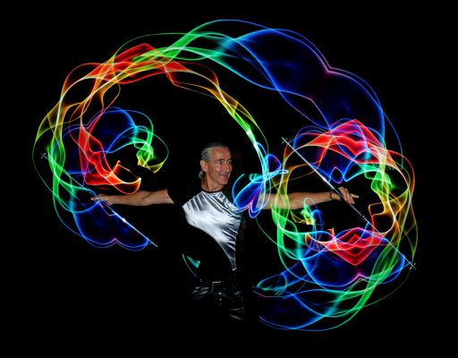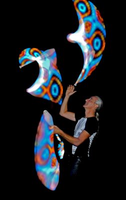 Meine LED-Show dauert 15 Minuten und ist eine hochmoderne Performance bei der ich mit computergesteuerten Bällen, Keulen und Stäben faszinierende Muster in die Dunkelheit jongliere und wirble. Alle Requisiten folgen einer perfekt zur Musik abgestimmten Lichtchoreographie, sodass Musik, Licht und Artistik zu einer Einheit verschmelzen.